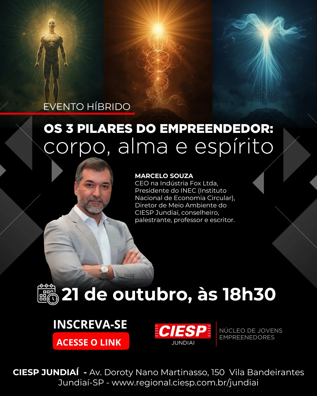 O palestrante será Marcelo Souza, que vai abordar o tema: “Os 3 pilares do empreendedor: corpo, alma e espírito”. Marcelo Souza é CEO na Indústria Fox Ltda, presidente do INEC (Instituto Nacional de Economia Circular), diretor de Meio Ambiente do CIESP Jundiaí, conselheiro, palestrante, professor e escritor.