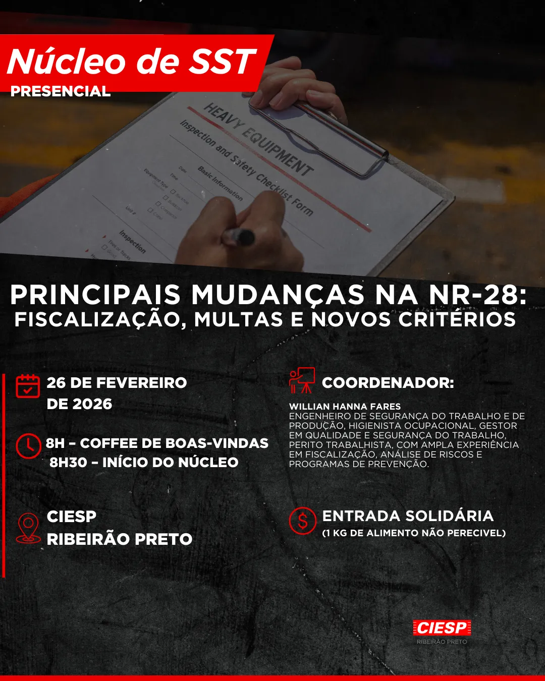 O CIESP de Ribeirão Preto tem o prazer de convidá-los para o Encontro do Núcleo de Saúde e Segurança do Trabalho (SST), que tem como propósito fortalecer a troca de experiências, ampliar o conhecimento técnico e apoiar empresas e profissionais na adequação às exigências legais em SST.