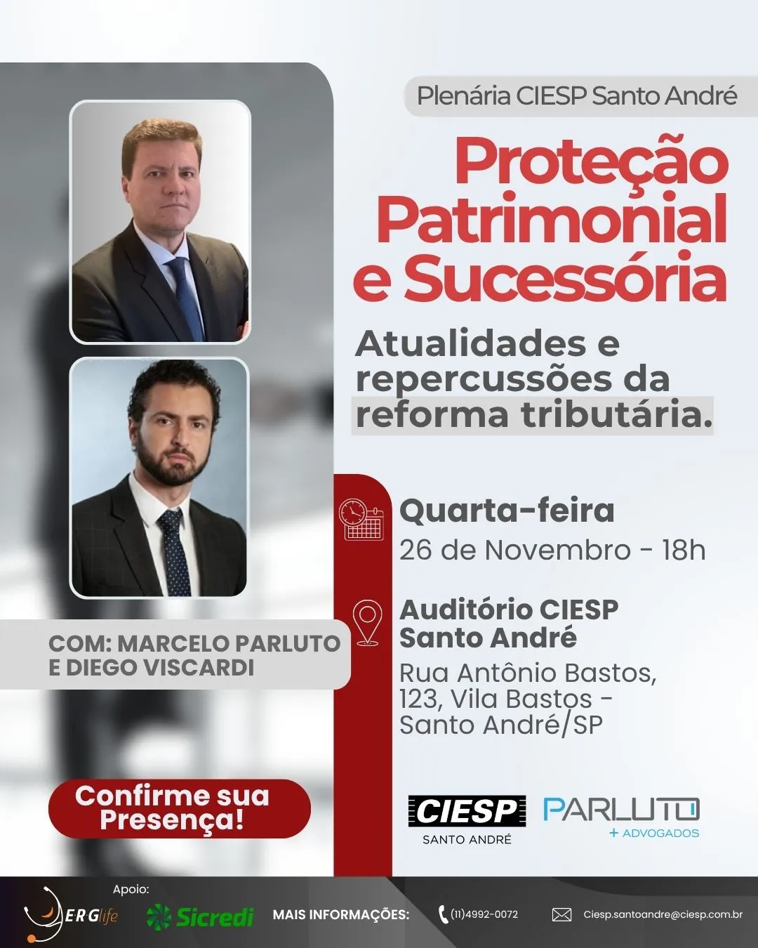 O CIESP Santo André promoverá, no dia 26 de novembro de 2025, às 18h, a plenária “Proteção Patrimonial e Sucessória: atualidades e repercussões da reforma tributária”.