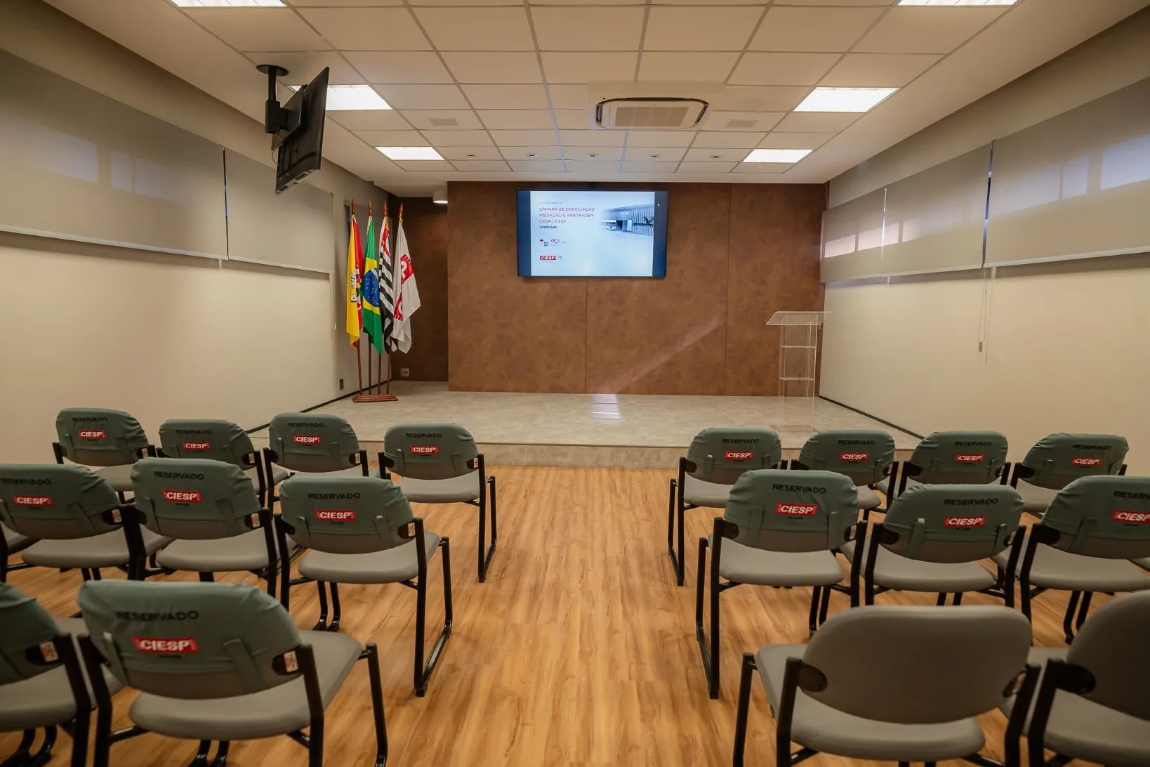 Conta com ar-condicionado, cadeiras sem prancheta e estrutura completa de som e vídeo (TVs e microfones sem fio).