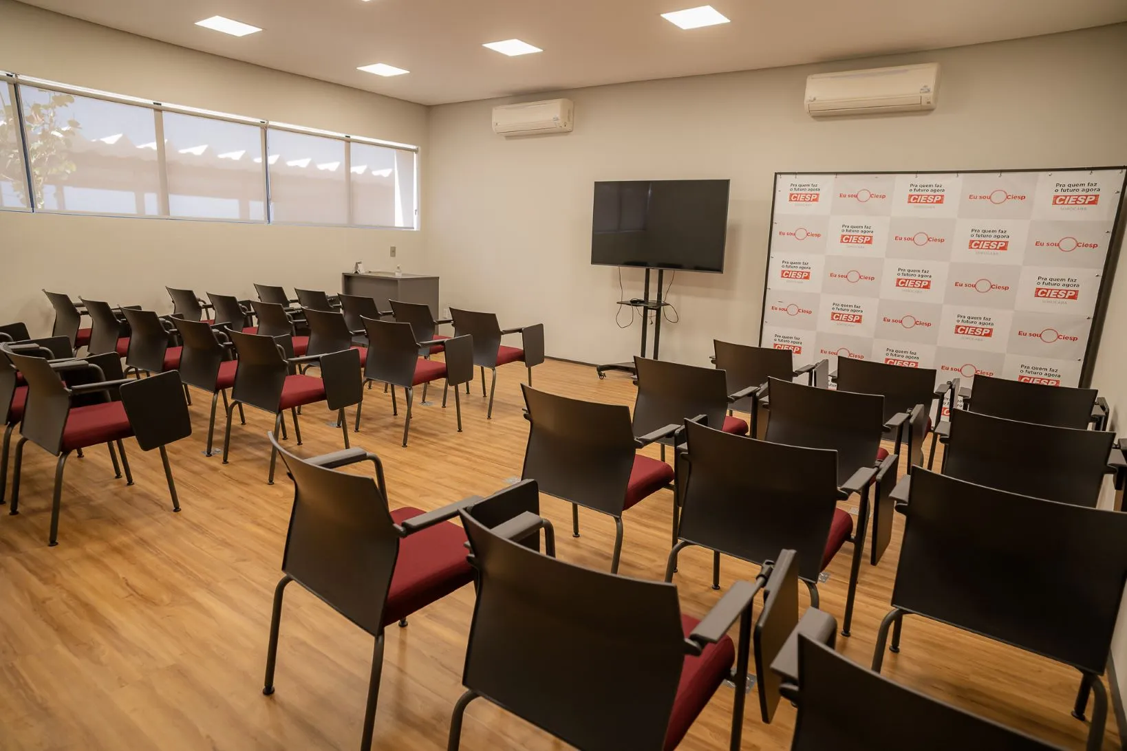 Equipada com ar-condicionado, cadeiras com prancheta e TV de 65”.